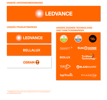 LEDVANCE ist eines der weltweit führenden Unternehmen in der Lichtindustrie und expandiert in den Bereich der erneuerbaren Energien. Um unsere breite Palette an Produkten und Lösungen widerzuspiegeln, bieten wir unter dem Dach von LEDVANCE eine Vielzahl von Marken an. Unter der Marke LEDVANCE vertreiben wir ein umfangreiches Produktsortiment für private, gewerbliche und industrielle Anwendungen. In Absprache mit OSRAM vertreiben wir auch eine große Auswahl an Produkten unter den Marken OSRAM und SYLVANIA. Darüber hinaus haben wir eine Fülle von Marken für unsere eigenen Technologien und Produkte, wie unser Lichtmanagementsystem VIVARES, unsere Ladeinfrastruktur PHASE EV™ sowie unser Human Centric Lighting-System BIOLUX.